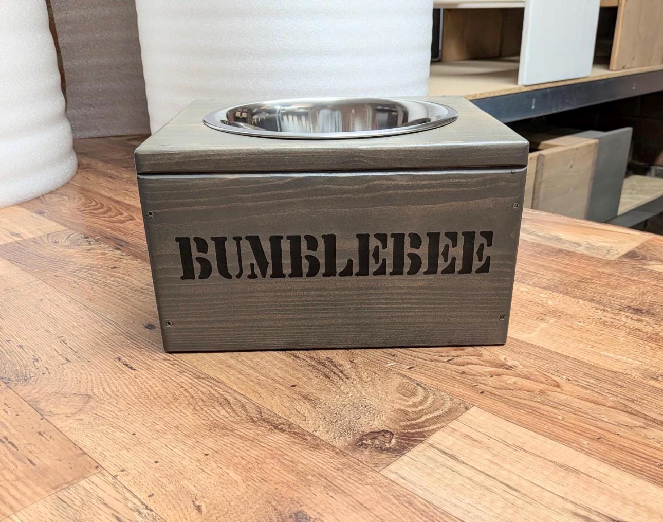 This charming wooden pet bowl stand is a real eye-catcher and has a particularly elegant look. Shown here is the "Grey Bamboo" model – suitable for very small to very large pets. A special highlight is the option for personalized (name) printing and a choice of two fonts. Symbols can also be printed. A version without printing is also available (and is subject to return).